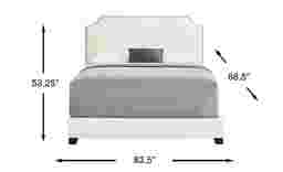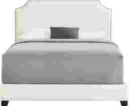 The room exhales, and rest feels closer as the Kimberley bed brings tailored calm to the bedroom. Its Belgrave silhouette rises in smooth white upholstery, with nailhead trim tracing the gentle arch and rounded corners of the headboard. A simple upholstered footboard and small black feet keep the look clean and composed, letting understated elegance do the talking.