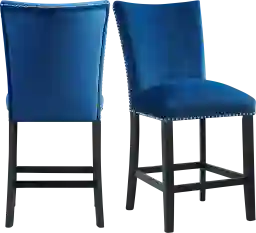 The Kimlie blue counter height chair set instantly updates your dining room. This duo is upholstered in a show stopping blue velvet, which will elevate your dining room to the next level. Chrome nail head trim outlines the edges of these chairs, adding extra flair to this already stunning set. The blue velvet pairs beautifully with the sleek, black finish on the legs. Add these chairs to your home today for a look that will never go out of style. Customer assembly is required.