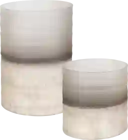 These Kimra modern cylindrical vases feature a soft gradient design with textured horizontal lines, offering a subtle yet sophisticated look. Perfect for adding a touch of elegance to any space, their neutral tones complement a variety of interior styles. Ideal for displaying floral arrangements or as standalone decor pieces.