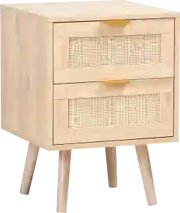 Add a retro inspired accent to your bedroom with the stunning Kincell nightstand. Comprised of sturdy wood showcasing a light oak brown finish. Two drawers and a square tabletop offer plenty of space for all your bedside essentials. This nightstand features woven rattan drawer faces and gold tone metal handles for eye catching style. A handy piece brimming with personality, and sure to enhance any bedroom. Customer assembly is required.