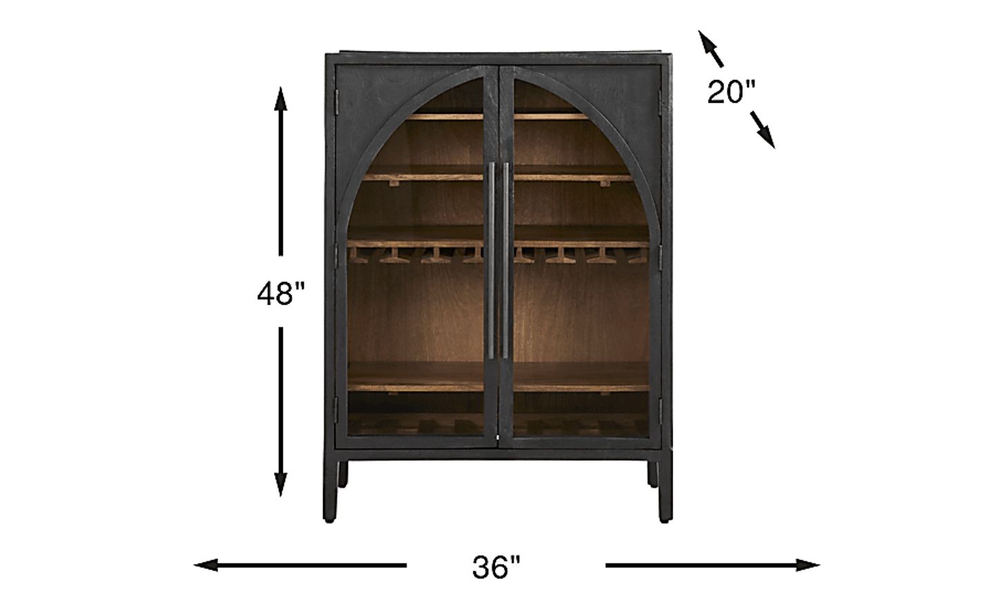 The quiet sophistication of a curated gallery blends with easy modern dining in the Kings Road wine cabinet's sculptural silhouettes and balanced design. Its architectural charm comes to life through its symmetrical arched glass doors, brought into focus by a bold two-tone finish. The rich black exterior frames each curve with dramatic contrast, while the warm natural brown interior adds depth and dimension. Behind the cabinet doors, four spacious shelves offer room for dinnerware and decorative accents, while the wine glass rack on the third shelf provides room to hang your favorite glassware. Elongated metal pulls in black enhance the clean lines and complete the piece with elevated simplicity.