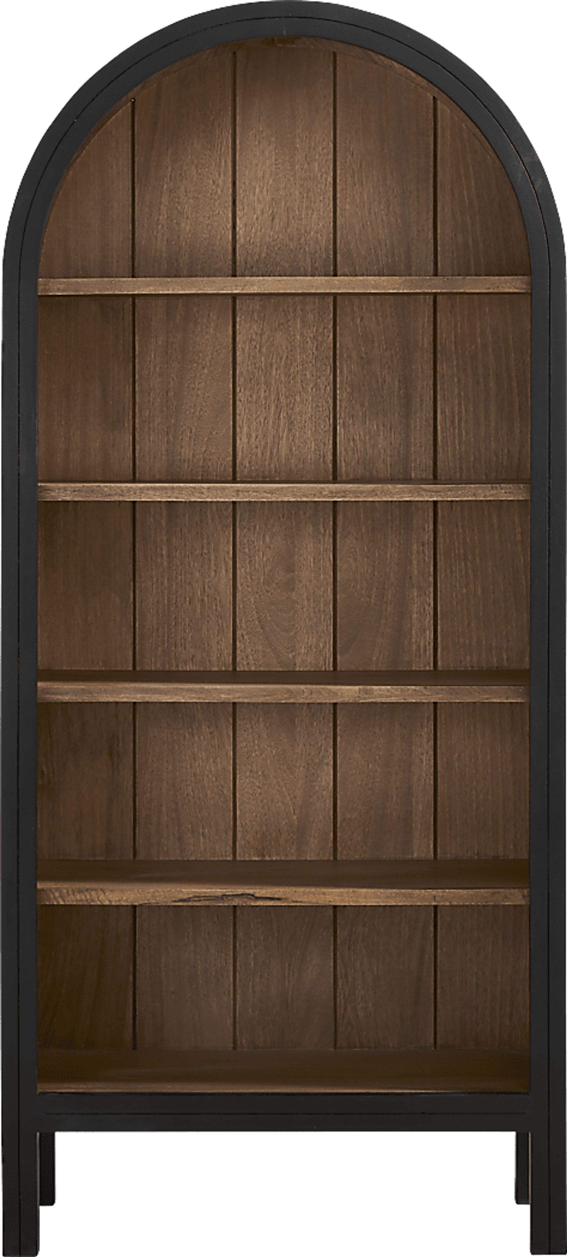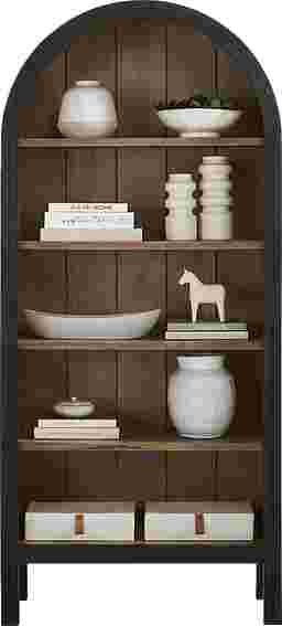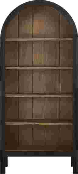 The quiet sophistication of a curated gallery blends with easy modern dining in the Kings Road display cabinet's sculptural silhouette and refined design. Its architectural charm comes to life through its arched shape, brought into focus by a bold two-tone finish. The rich black exterior frames its curve with dramatic contrast, while the warm natural brown interior adds depth and dimension. Five spacious shelves offer room for dinnerware, glassware and decorative accents.