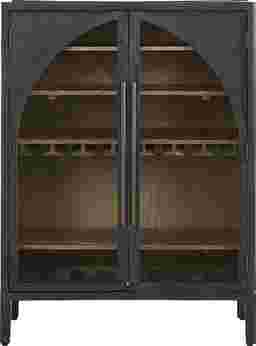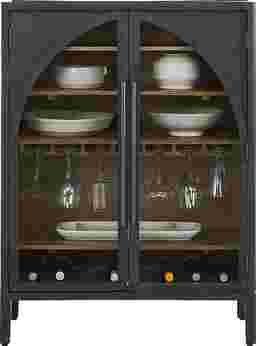 The quiet sophistication of a curated gallery blends with easy modern dining in the Kings Road wine cabinet's sculptural silhouettes and balanced design. Its architectural charm comes to life through its symmetrical arched glass doors, brought into focus by a bold two-tone finish. The rich black exterior frames each curve with dramatic contrast, while the warm natural brown interior adds depth and dimension. Behind the cabinet doors, four spacious shelves offer room for dinnerware and decorative accents, while the wine glass rack on the third shelf provides room to hang your favorite glassware. Elongated metal pulls in black enhance the clean lines and complete the piece with elevated simplicity.
