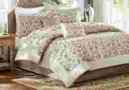 Make any bedroom a luxurious getaway with the Kingsley king comforter set. This unique collection, in soft shades of ivory and taupe, features an intricate ironwork design with an opulent chenille fabrication that not only looks elegant, but feels that way as well. Twin euro shams bring the eye up to the top of the bed with delicate embroidery framing each velvet sham. Two decorative pillows complete this look with corresponding embroidery to match the pattern at the top of the bed. The collection also includes a comforter, one bed skirt and two standard shams. Comforter/Sham: 100% Polyester chenille jacquard face and 100% Polyester Microfiber back. Machine wash cold, gentle cycle, and separately. Do not bleach. Tumble dry low, remove promptly. Do not iron. If there is no free movement in the washer or dryer, use large capacity commercial washer/dryer.