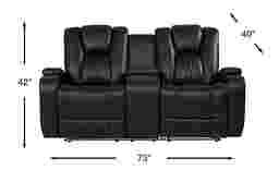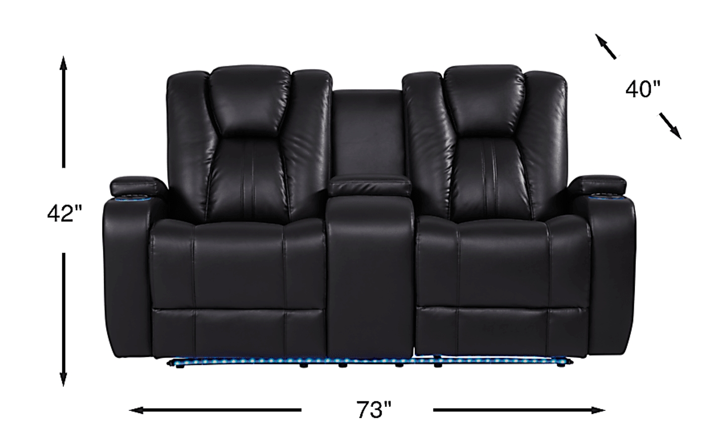 Experience comfort unlike anything you've felt before with the indulgent design of the Kingvale Court dual power reclining loveseat. Upholstered in supple black fabric, this luxurious loveseat features power reclining headrests and chaise style footrests, providing plush support from head to toe with the touch of a button. Storage compartments in the armrests and a center storage console keep your essentials close at hand, while a lighted cup holder with USB ports in each arm rest even provides a spot for a beverage and connectivity. Adjustable LED floor lighting offers just the right amount of light. This cleverly designed loveseat has it all! 24" extension when footrest is fully reclined. Allow 6" for wall spacing. Upholstery: 82.5% Polyester, 17.5% Polyurethane