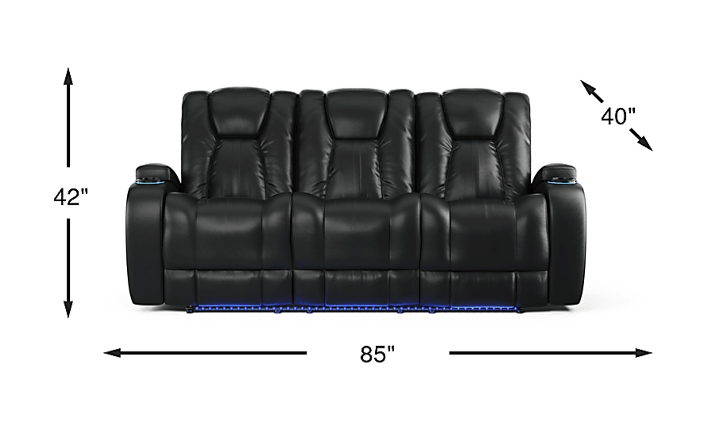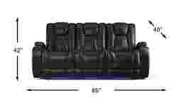 Welcome to your new home base. Offering modern connectivity and unsurpassed comfort, the Kingvale Court dual power reclining sofa has everything you need to settle in and stay comfy for the long haul. Upholstered in luxuriously supple black fabric, this deluxe sofa features a storage compartment and lighted cup holder in each armrest in addition to a pull- down center seat back boasting a tray with two cup holders, twin reading lights, and two wireless chargers. Power reclining headrests and footrests keep every inch of your body supported with the touch of a button. Adjustable LED floor lighting provides just the right amount of light when needed. Whether you're watching TV, using a laptop or taking a nap, this luxury sofa has got you covered! 24" extension when footrest is fully reclined. Allow 6" for wall spacing. Upholstery: 82.5% Polyester, 17.5% Polyurethane