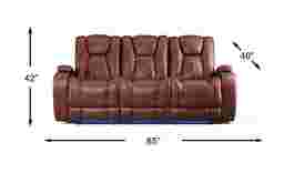 Welcome to your new home base. Offering modern connectivity and unsurpassed comfort, the Kingvale Court dual power reclining sofa has everything you need to settle in and stay comfy for the long haul. Upholstered in luxuriously supple mocha brown fabric, this deluxe sofa features a storage compartment and lighted cup holder in each armrest in addition to a pull-down center seat back boasting a tray with two cup holders, twin reading lights, and two wireless chargers. Power reclining headrests and footrests keep every inch of your body supported with the touch of a button. Adjustable LED floor lighting provides just the right amount of light when needed. Whether you're watching TV, using a laptop or taking a nap, this luxury sofa has got you covered! 24" extension when footrest is fully reclined. Allow 6" for wall spacing. 82.5% Polyester, 17.5% Polyurethane