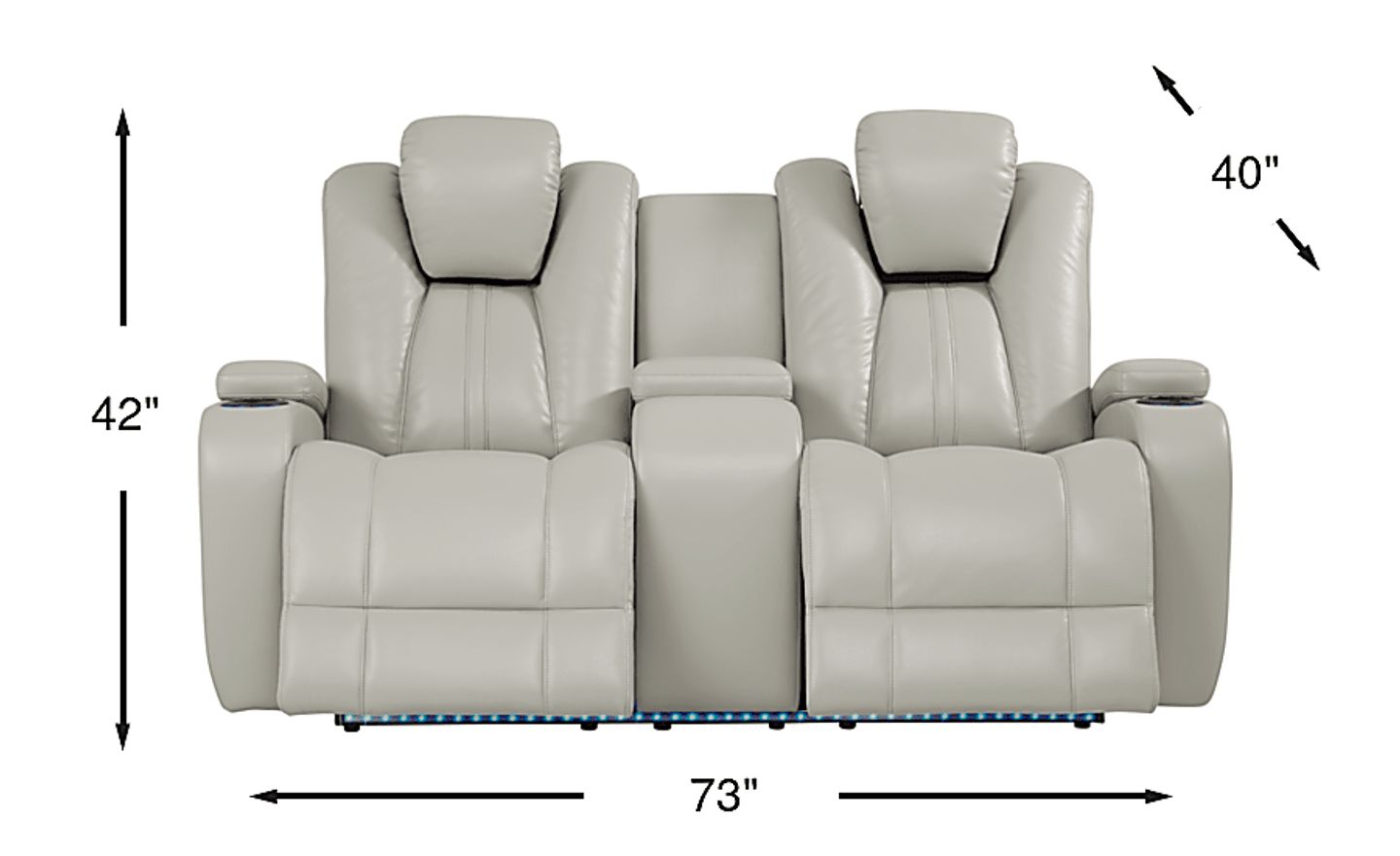 Experience comfort unlike anything you've felt before with the indulgent design of the Kingvale Court dual power reclining loveseat. Upholstered in supple platinum colored fabric, this luxurious loveseat features power reclining headrests and chaise style footrests, providing plush support from head to toe with the touch of a button. Storage compartments in the armrests and a center storage console keep your essentials close at hand, while a lighted cup holder with USB ports in each arm rest even provides a spot for a beverage and connectivity. Adjustable LED floor lighting offers just the right amount of light. This cleverly designed loveseat has it all! 24" extension when footrest is fully reclined. Allow 6" for wall spacing. Upholstery: 82.5% Polyester, 17.5% Polyurethane