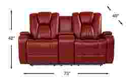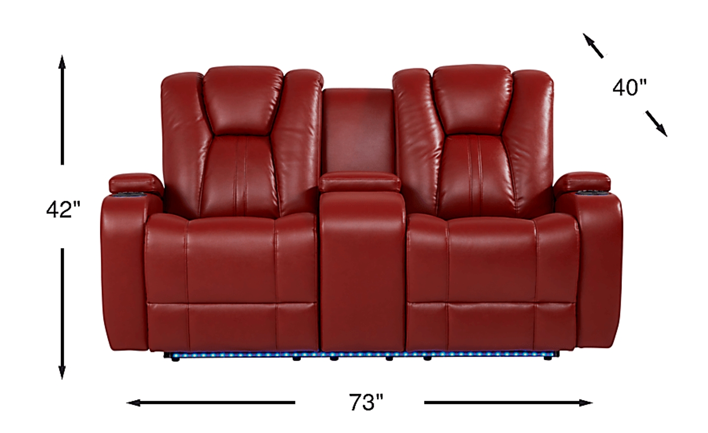 Experience comfort unlike anything you've felt before with the indulgent design of the Kingvale Court dual power reclining loveseat. Upholstered in supple red fabric, this luxurious loveseat features power reclining headrests and chaise style footrests, providing plush support from head to toe with the touch of a button. Storage compartments in the armrests and a center storage console keep your essentials close at hand, while a lighted cup holder with USB ports in each arm rest even provides a spot for a beverage and connectivity. Adjustable LED floor lighting offers just the right amount of light. This cleverly designed loveseat has it all! 24" extension when footrest is fully reclined. Allow 6" for wall spacing. Upholstery: 82.5% Polyester, 17.5% Polyurethane
