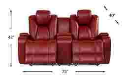 Experience comfort unlike anything you've felt before with the indulgent design of the Kingvale Court dual power reclining loveseat. Upholstered in supple red fabric, this luxurious loveseat features power reclining headrests and chaise style footrests, providing plush support from head to toe with the touch of a button. Storage compartments in the armrests and a center storage console keep your essentials close at hand, while a lighted cup holder with USB ports in each arm rest even provides a spot for a beverage and connectivity. Adjustable LED floor lighting offers just the right amount of light. This cleverly designed loveseat has it all! 24" extension when footrest is fully reclined. Allow 6" for wall spacing. Upholstery: 82.5% Polyester, 17.5% Polyurethane