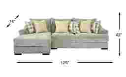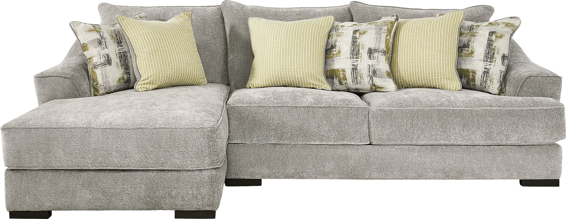 Clean, solid lines accompanied by the alluring pull of unremitting comfort make the Kinley sectional the landing place every nap dreams about. Upholstered in plush woven chenille, this gray contemporary piece features stylish flare arms and reversible seat cushions that clip on to the frame with D-rings, making it both sturdy and easy to clean. Channeled backs and flare arms add a sense of the provocative while feather blend jacquard pillows and block legs in a black finish add an eye-catching contrast. Right arm sofa and left arm chaise. Upholstery: 100% Polyester.