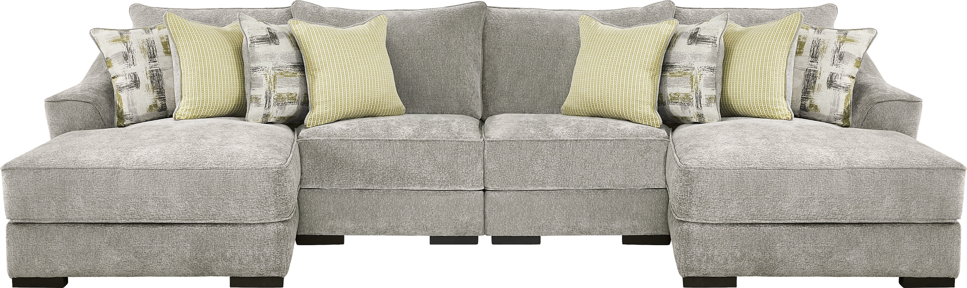 Clean, solid lines accompanied by the alluring pull of unremitting comfort make the Kinley sectional the landing place every nap dreams about. Upholstered in plush woven chenille, this gray contemporary piece features stylish flare arms and reversible seat cushions that clip on to the frame with D-rings, making it both sturdy and easy to clean. Channeled backs and flare arms add a sense of the provocative while feather blend jacquard pillows and block legs in a black finish add an eye-catching contrast. Upholstery: 100% Polyester.