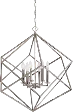 The Kinsley Place pendant features an elegant, polished nickel cube interlocked with its twin, while at the center of their intersection is a 6 light candle cluster with mini crystal bobeches. This pendant is perfect for a dining room or living room setting. Includes 15' wire and 7' chain for adjustable installation. Professional installation by an electrician is recommended.