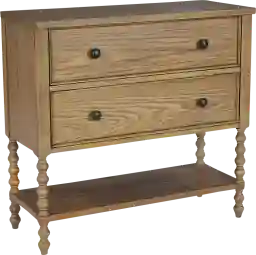 Elevate your living room with the sophisticated style of the Kiphen brown accent cabinet. This 2-drawer accent cabinet features a solid wood frame and elegant turned legs, in a camel oak finish, for a clean traditional look. The 2 drawers open easily on metal glides and provide plenty of storage space for your essentials. Complete with a lower shelf, the Kiphen brings a perfect blend of functionality and charming style to your home decor. Customer assembly is required.