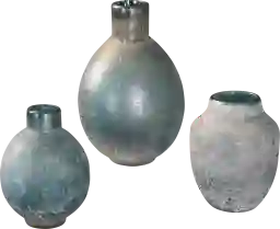 The Kipley glass bottles are finished in varying shades of blue-green with a textured, rust ivory glaze. Color variations are to be expected and are part of their unique charm. Sizes S-4x5x4, M-4x6x4, L-5x8x5