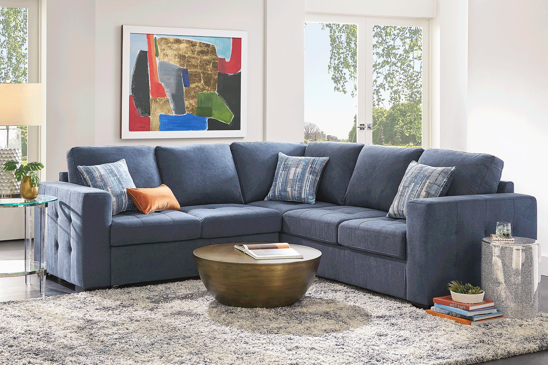 Create an ideal living room space with the Kirkwell sectional. This piece features a beautiful blue woven upholstery with tufting on the outside of the track arms create a tailored look. This sectional provides ample seating perfect for movie watching or catching up on your favorite show. Upholstery: 100% Polyester.