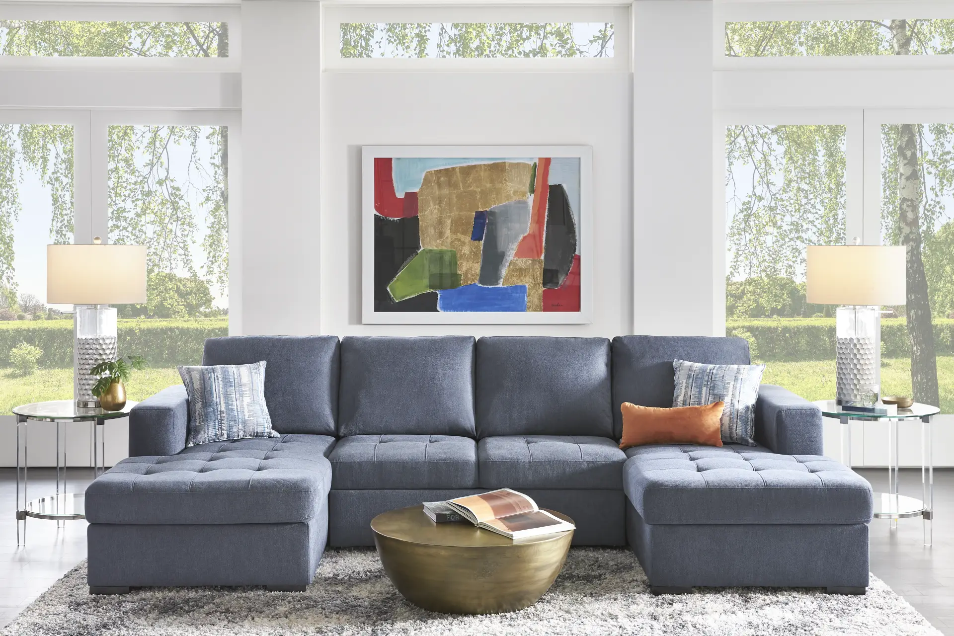 Create an ideal living room space with the Kirkwell sectional. This piece features a beautiful blue woven upholstery with tufting on the outside of the track arms create a tailored look. This sectional provides ample seating perfect for movie watching or catching up on your favorite show. This sectional has a delightful U shape that makes it comfortable and ideal of TV or conversation. Upholstery: 100% Polyester.