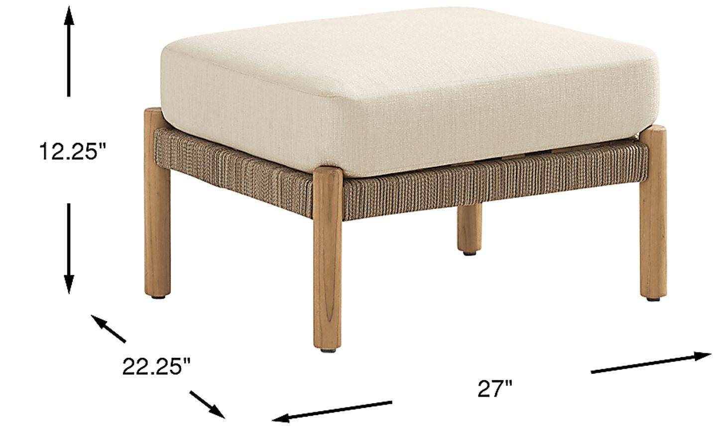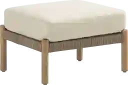 A wave of pure ease carries you into effortless bliss as the Koda collection nestles every moment in the indulgent luxury of a sailboat gliding through seas made of glass. All-weather rope in colorfast beige coils around a frame of rust resistant aluminum, running parallel to solid teak legs in a natural finish. A beige outdoor cushion offers the perfect touch of durable softness to this ottoman.