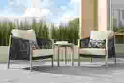 A wave of pure ease carries you into effortless bliss as the Koda collection nestles every moment in the indulgent luxury of a sailboat gliding through seas made of glass. All-weather rope in colorfast charcoal gray coils around frames of rust resistant aluminum, running parallel to solid teak legs in a natural finish. Outdoor cushions in beige offer the perfect touch of durable softness for each chat chair. A graceful end table with a white stone top completes the look. Included are two chat chairs and a cocktail table.
