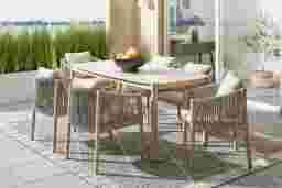 A wave of pure ease carries you into effortless bliss as the Koda collection nestles every moment in the indulgent luxury of a sailboat gliding through seas made of glass. All-weather rope in colorfast beige coils around frames of rust resistant aluminum, running parallel to solid teak legs in a natural finish. Outdoor cushions in beige offer the perfect touch of durable softness to each arm chair. The star of this dining set, a 71" white stone top perches elegantly on the solid teak base of the stunning rectangular dining table.