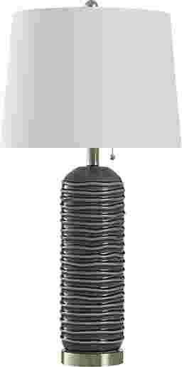 This piece features a durable ceramic body with a unique ridged design and silver steel accents. Based on our expertise with these materials, we recommend dusting the lamp regularly with a soft, dry cloth. For any spots on the ceramic or steel, a light application of mild soap and water is effective. To protect the finish, avoid using harsh chemicals or abrasive cleaners that could dull the glossy surface or tarnish the metallic accents.