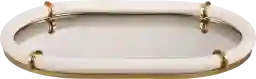The Konree oval tray showcases a white faux shagreen leather wrap featuring brass plated steel bands and a mirrored interior that elevates this sophisticated design.