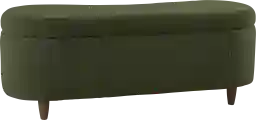 Introducing the Kristencreek green storage bench, a stylish and versatile piece that fits seamlessly into any room of your home. Featuring clean lines and a curved front, it also has a straight back that fits snugly against a wall or bed. The upholstered bench sits atop solid wood legs, providing both comfort and style. Customer assembly is required.