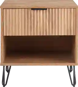 The Kroc II brown nightstand brings tasteful modern glam to your home. With its unique vertical ribbed drawer front, full extension and soft close drawers, and stylish splayed metal legs, this nightstand is not only a true beauty but also made with quality. Also comes with sleek metal horizontal handles. Customer assembly is required.