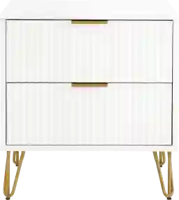 The Kroc III white nightstand brings tasteful modern glam to your home. With its unique vertical ribbed drawer front, full extension and soft close drawers, and stylish splayed metal legs, this nightstand is not only a true beauty but also made with quality. Also comes with sleek metal horizontal handles. Customer assembly is required.