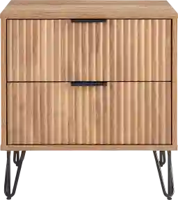 This nightstand achieves its modern glam look through a sophisticated contrast of textures. The unique vertical ribbed drawer fronts provide architectural depth, while the splayed metal legs and sleek horizontal handles offer a polished, contemporary edge. This combination allows the piece to serve as a stylish focal point that pairs beautifully with upholstered headboards or metallic bedroom decor.