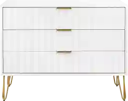 The Kroc V white dresser brings tasteful modern glam to your home. With its unique vertical ribbed drawer front, full extension and soft close drawers, and stylish splayed metal legs, this dresser is not only a true beauty but also made with quality. Also comes with sleek metal horizontal handles. Customer assembly is required.