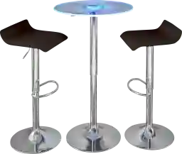 The bar table is designed with an acrylic top featuring etched swirls that catch and amplify light. The integrated multi-colored LEDs phase between red, blue, and green, creating glowing edges that serve as a vibrant focal point. For your convenience, the set includes adapters that plug directly into the base to power the lighting system.