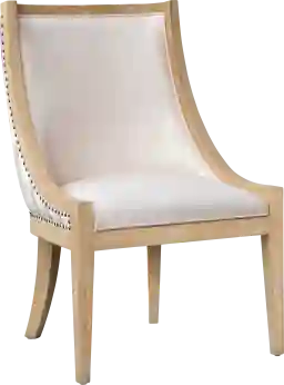 Introducing the epitome of farmhouse elegance, the Kutscher beige armchair. Showcasing a charming curved back profile, recessed arms, and a genuine wood frame in a rustic reclaimed wheat finish. The touch of brass nail head trim elevates its sophistication, making every meal a refined experience. This upholstered chair introduces a subtle beauty to your dining room. Featuring an exposed wood frame, this chair is upholstered in a soft fabric for a charming farmhouse look. The recessed arms and tapered wood legs create an elegant silhouette, while the brass nail head trim elevates the design to bring style and sophistication to your dining space.