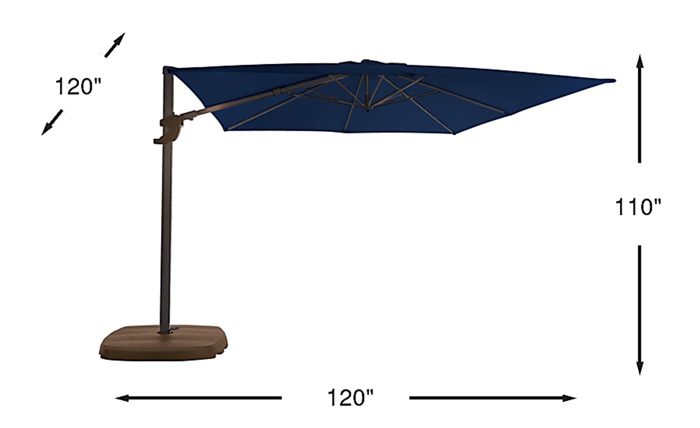 Providing flexible coverage for a wide range of outdoor setups, the La Mesa Cove cantilever style umbrella is a fantastic choice. This 10' square shaped umbrella offers high 98% UV protection with long lasting Sunbrella fabric in a navy color. Durable too, Sunbrella fabric is known for its ability to resist fading, mold and mildew. Easy to operate with a hand crank and offering versatile coverage, the umbrella rotates 360 degrees with a foot pedal and has an impressive front to back tilting feature. The pole and 50 pound sand-weighted base are crafted of rust proof powder coated aluminum in a bronze finish. 100% Sunbrella fabric.