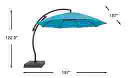 Providing flexible coverage for up to 108" rectangle tables, the La Mesa Cove cantilever style umbrella is a fantastic choice. This 13' octagon shaped umbrella, positioned on a curved frame, offers high 98% UV protection with long lasting Sunbrella fabric in an aqua blue color. Durable too, Sunbrella fabric is known for its ability to resist fading, mold and mildew. Easy to operate with a hand crank and offering versatile coverage, the umbrella easily rotates 360 degrees with a foot pedal and has an impressive front to back tilting feature. The umbrella can be locked into place once the desired tilted position is found. The pole and 400 pound sand-weighted base are crafted of rust proof powder coated aluminum and a very durable HDPE plastic both in a bronze finish. 100% Sunbrella fabric. To clean Sunbrella fabric remove dirt and spray on cleaning solution (water and mild soap), then use a soft bristle brush or sponge. Allow cleaning solution to soak into fabric and rinse thoroughly until soap residue is removed. Air dry. Do not dry clean.