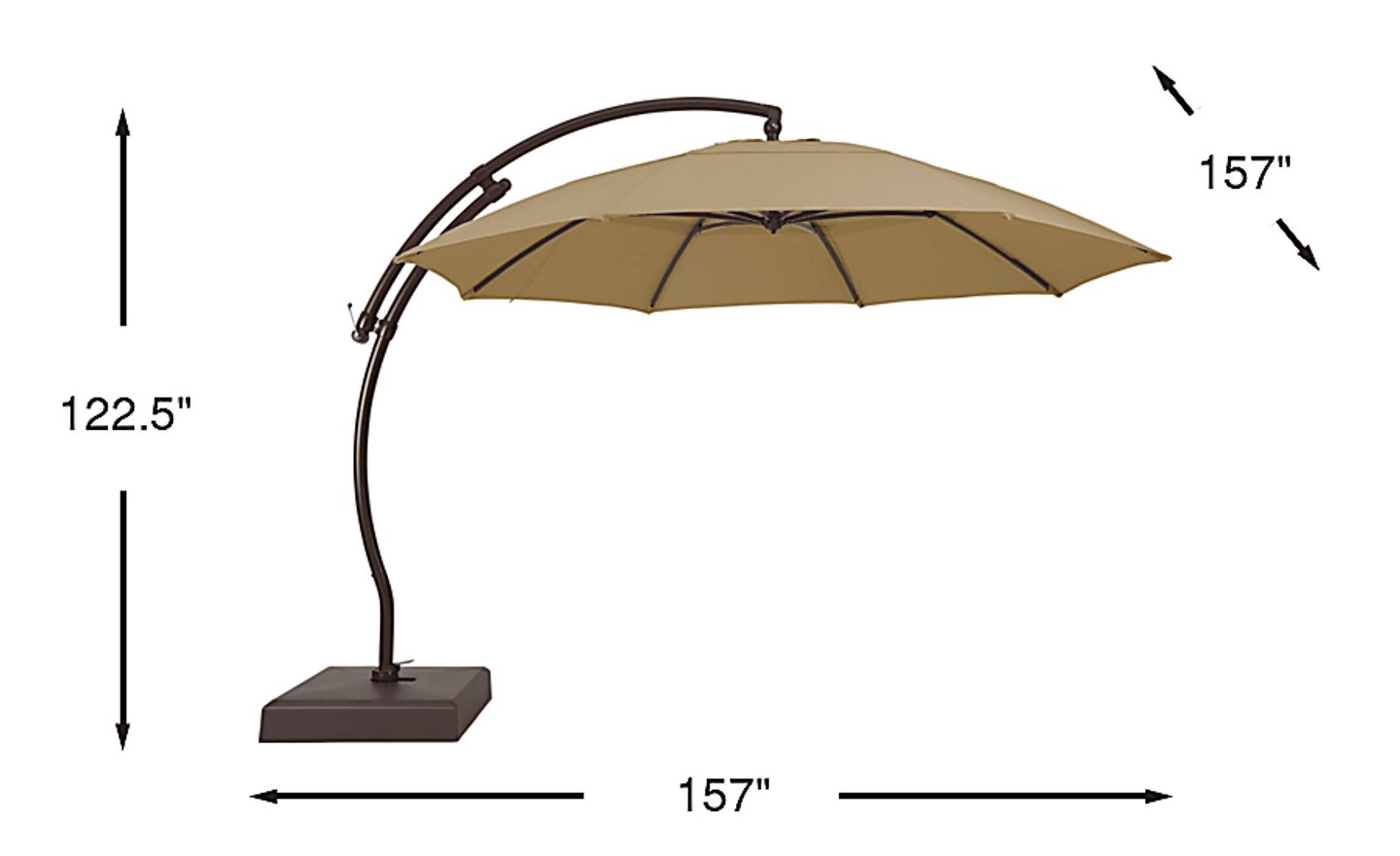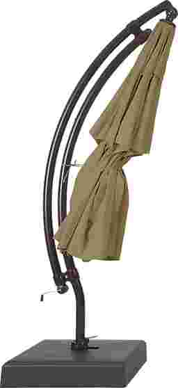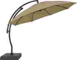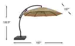 Providing flexible coverage for up to 108" rectangle tables, the La Mesa Cove cantilever style umbrella is a fantastic choice. This 13' octagon shaped umbrella, positioned on a curved frame, offers high 98% UV protection with long lasting Sunbrella fabric in a neutral beige color. Durable too, Sunbrella fabric is known for its ability to resist fading, mold and mildew. Easy to operate with a hand crank and offering versatile coverage, the umbrella easily rotates 360 degrees with a foot pedal and has an impressive front to back tilting feature. The umbrella can be locked into place once the desired tilted position is found. The pole and 400 pound sand-weighted base are crafted of rust proof powder coated aluminum and a very durable HDPE plastic both in a bronze finish. 100% Sunbrella fabric. To clean Sunbrella fabric remove dirt and spray on cleaning solution (water and mild soap), then use a soft bristle brush or sponge. Allow cleaning solution to soak into fabric and rinse thoroughly until soap residue is removed. Air dry. Do not dry clean.