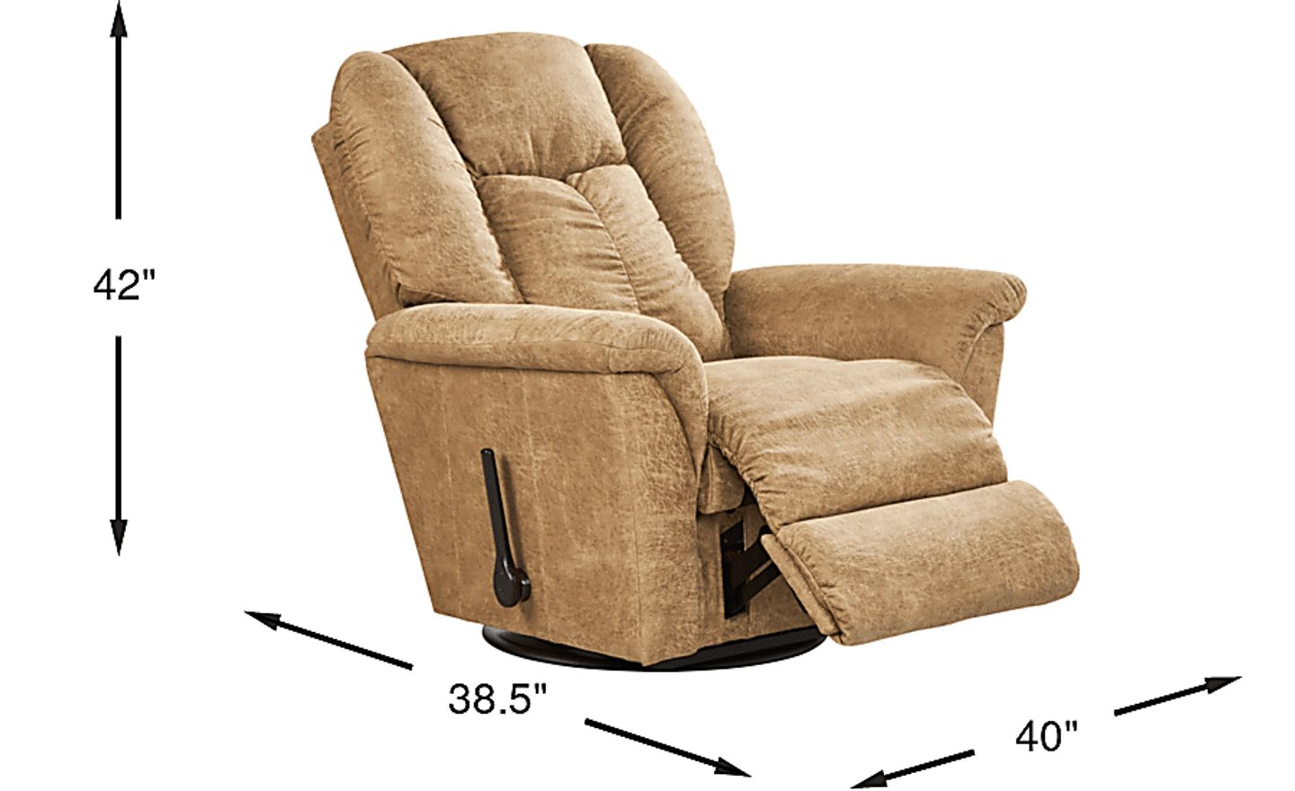This chair has a width of 40 inches and a depth of 38.5 inches. While it offers a generous seating area, its swivel and rocking capabilities allow it to fit well into various room layouts. When placing the chair, ensure there is sufficient clearance behind the backrest to allow the manual recline mechanism to fully extend without hitting a wall.