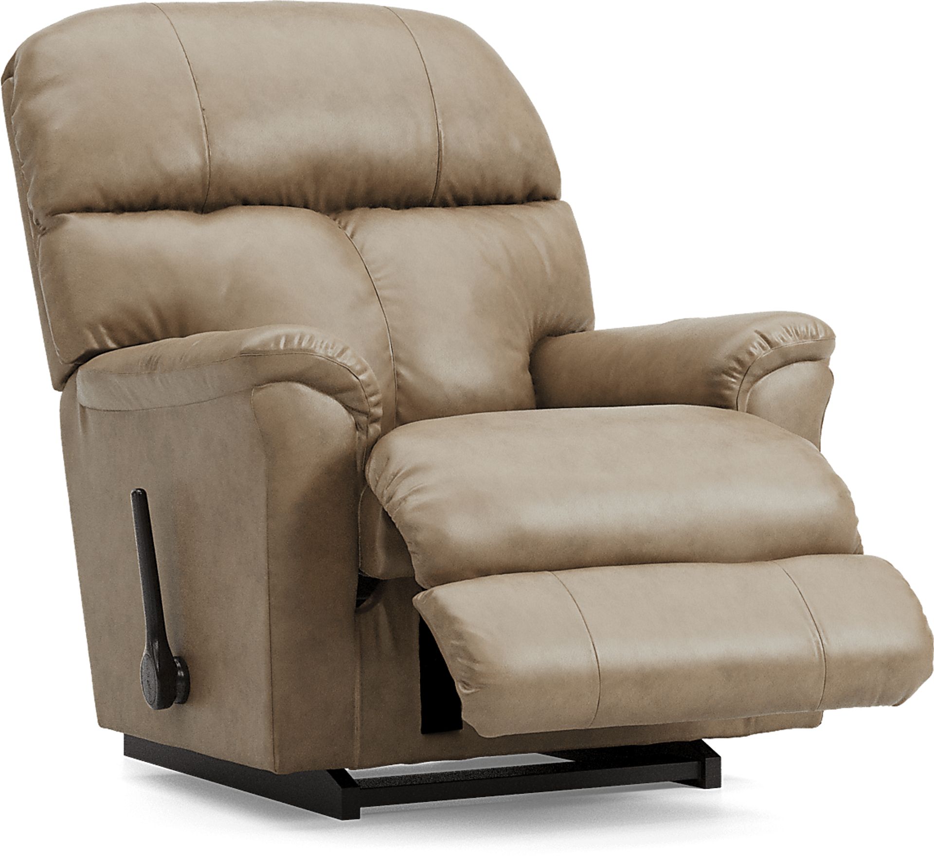The sumptuous upholstery and casual design details of the Reed rocker recliner invite long movie nights and restful relaxation any time the mood strikes. This transitional piece features beige top grain leather where the body touches and ultra-plush padding. Deep vertical and horizontal seams on the back and headrest create pockets of soft support, keeping the body aligned in the ideal position for extended relaxation. Padded flare arms and a one-piece chaise seat and footrest create a continuous zone of comfort when reclined. The 3-position footrest and 16-position ratcheting recline mechanism can be engaged independently of one another, allowing users to find their own perfect combination. When not reclining, the tranquil rocking function makes this the most soothing seat in the house whether or not the footrest is in use. Upholstery: Top grain leather where the body touches.
