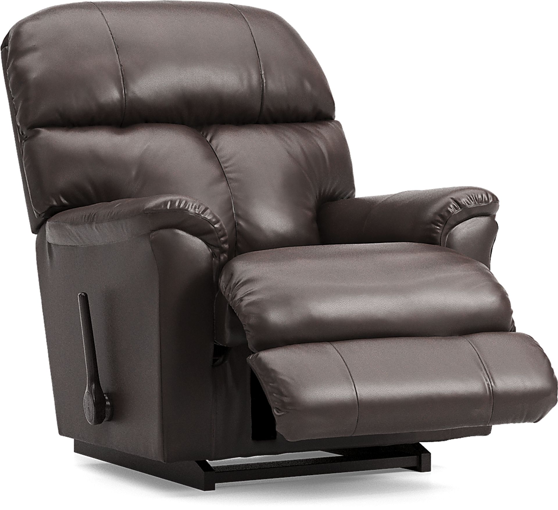The sumptuous upholstery and casual design details of the Reed rocker recliner invite long movie nights and restful relaxation any time the mood strikes. This transitional piece features beige top grain leather where the body touches and ultra-plush padding. Deep vertical and horizontal seams on the back and headrest create pockets of soft support, keeping the body aligned in the ideal position for extended relaxation. Padded flare arms and a one-piece chaise seat and footrest create a continuous zone of comfort when reclined. The 3-position footrest and 16-position ratcheting recline mechanism can be engaged independently of one another, allowing users to find their own perfect combination. When not reclining, the tranquil rocking function makes this the most soothing seat in the house whether or not the footrest is in use. Upholstery: Top grain leather where the body touches.