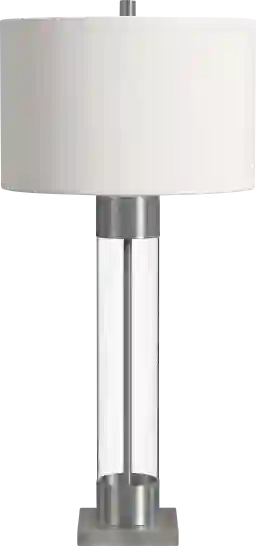 The Lacera Edge lamp is crafted of clear glass and brushed nickel with a white drum shade. The hand crafted details produced by a skilled artist lends itself to a unique technique and will vary slightly. Partial assembly may be required.