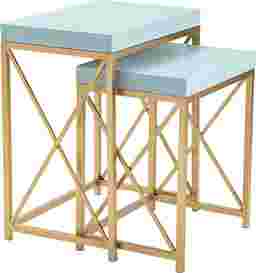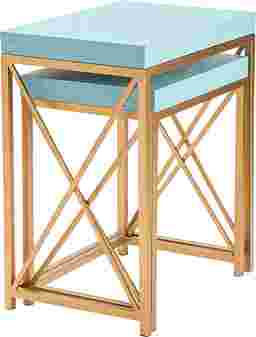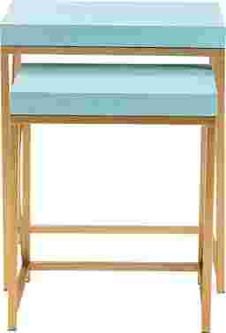 Add a pop of color to any room with the Ladurl nesting tables. Featuring a pastel blue table top and a gold iron base. Customer assembly is required.