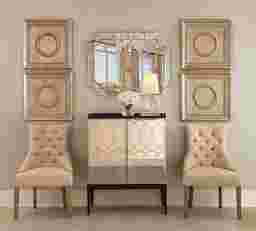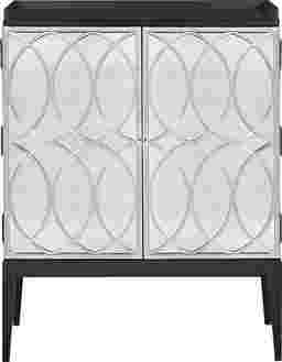 The Lafield accent cabinet features clear mirror doors with silver tone metal fretwork and a black case and legs. The interior of the case is painted black to match with shelf storage. Customer assembly required.