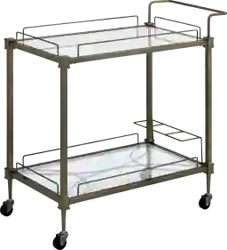 Invite timeless elegance into your gatherings with the Lagremas gold bar cart. This chic, mobile masterpiece glides into your space, adorned in an antique brass finish with transparent glass shelves that whisper sophistication. Its perfect for those who entertain, ready to serve up sparkling cocktails or an array of hors d'oeuvres with effortless poise. Whether youre hosting a lively soiree or a quiet evening for two, this cart combines functionality with an enchanting allure, turning every occasion into a memorable affair. Let it be the centerpiece of your celebrations, where each toast and every laugh is served with a hint of glamour. Customer assembly is required.