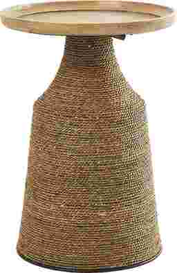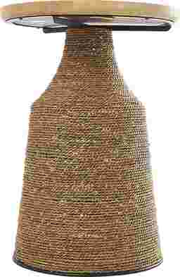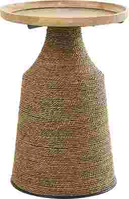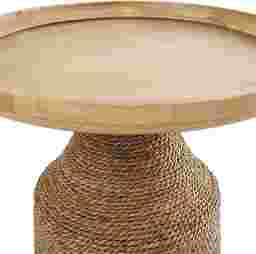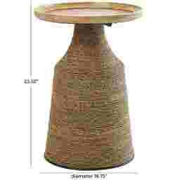 Bring free-spirited charm into your home with this bohemian-inspired accent table. The Lahaso is crafted with a solid rubber wood top, iron accents, and dried plant fibers wrapped around a sturdy MDF frame, it's built for both beauty and durability. The textured brown base pairs perfectly with the light brown oiled top, while black metal accents add just the right touch of sophistication. More than just functional, this table is a statement piece that infuses character and warmth into any room. Perfect for boho, eclectic, or modern interiors, it easily doubles as a side table, nightstand, or decorative accent. It's the perfect balance of style and practicality. Customer assembly is required.