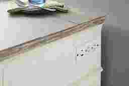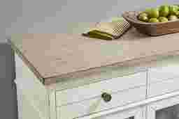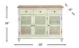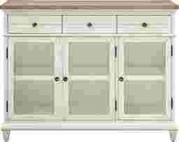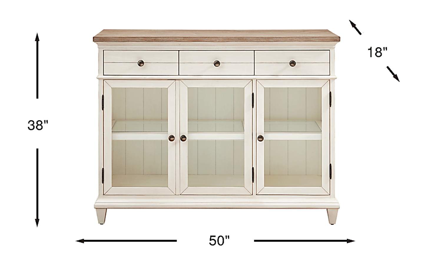 The familiar warmth and simplistic beauty of a refined farmhouse is the Lainey Cottage collection's calling card with its time-worn textures and classic craftsmanship. Crafted with pine and maple veneers in an antique white finish, this cottage-inspired server features a handsome rectangular frame with plank-style top in a weathered gray finish. Three framed top drawers echo the plank detailing above for a cohesive look, while offering space to keep small dining essentials neatly tucked away. Below, three cabinet doors reveal display shelves illuminated by a warm LED glow to highlight cherished china and décor. A built-in side power outlet adds convenient access for lamps or small appliances. Silver metal knobs and tall tapered legs complete the piece with a refined touch of sophistication.
