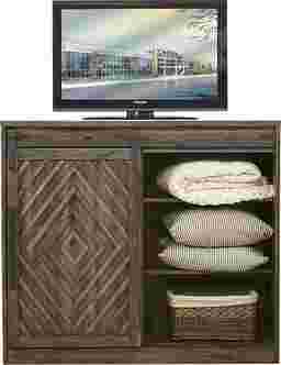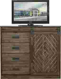A stylish option for a bedroom entertainment center or extra storage space, the Lake Arrowhead bureau offers versatility with rustic appeal. Crafted of acacia solids and veneers in a rustic brown finish, this useful piece features four drawers and two shelves behind a sliding farm door style panel with overlay detailing. English and French dovetail drawer construction adds a quality touch, while cast iron hardware completes the rustic design.