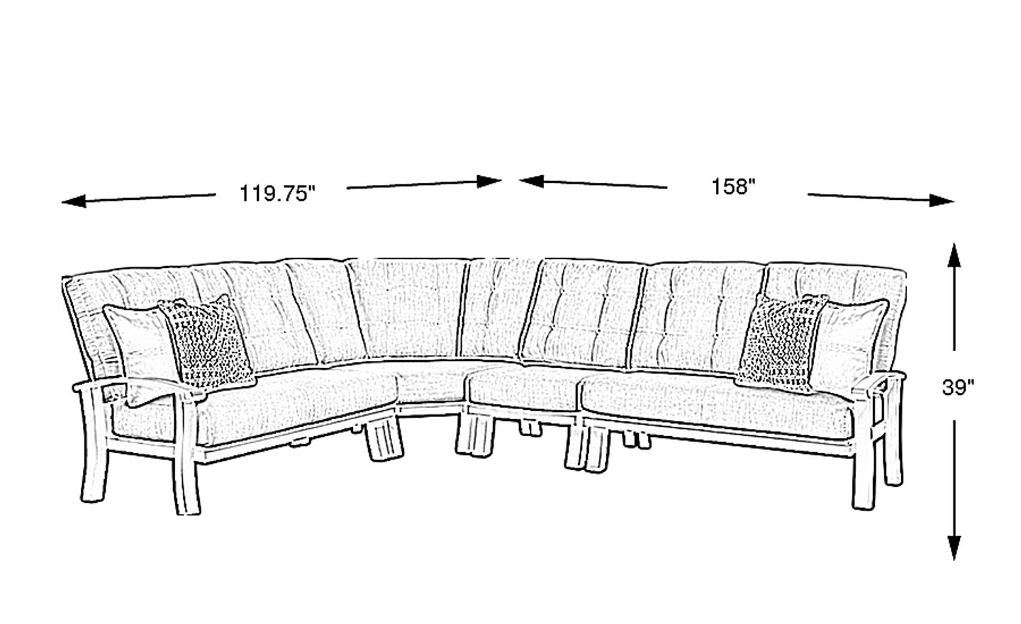 This 4-piece sectional has a footprint of 93"w x 117"d with a height of 38". When planning your layout, we recommend allowing at least 30 to 36 inches of clearance around the perimeter to ensure comfortable foot traffic and a natural flow on your deck or patio. Its generous scale makes it an inviting centerpiece for large family gatherings or outdoor entertaining.