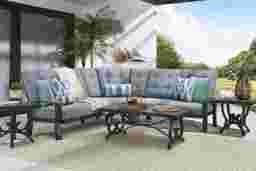 Take your style outside with the decorative and durable Lake Breeze sectional. This inviting piece features a slat back and is made with an aluminum frame in a rust resistant all-weather powder coat finish using a hand applied aged bronze finished UV protected top coat. Blueberry outdoor cushions on each of the five seats resist fading and are mold and mildew resistant, creating long lasting and comfortable seating that can be enjoyed for many seasons. Decorative button tufting details on the back cushions add an appealing, tailored touch.