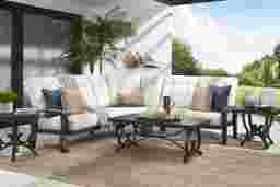 Take your style outside with the decorative and durable Lake Breeze sectional. This inviting piece features a slat back and is made with an aluminum frame in a rust resistant all-weather powder coat finish using a hand applied aged bronze finished UV protected top coat. Parchment colored Sunbrella cushions on each of the five seats resist fading and are mold and mildew resistant, creating long lasting and comfortable outdoor seating that can be enjoyed for many seasons. Decorative button tufting details on the back cushions add an appealing, tailored touch. 100% Sunbrella fabric. To clean Sunbrella fabric cushions remove dirt and spray on cleaning solution (water and mild soap), then use a soft bristle brush or sponge. Allow cleaning solution to soak into fabric and rinse thoroughly until soap residue is removed. Air dry. Do not dry clean.