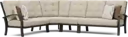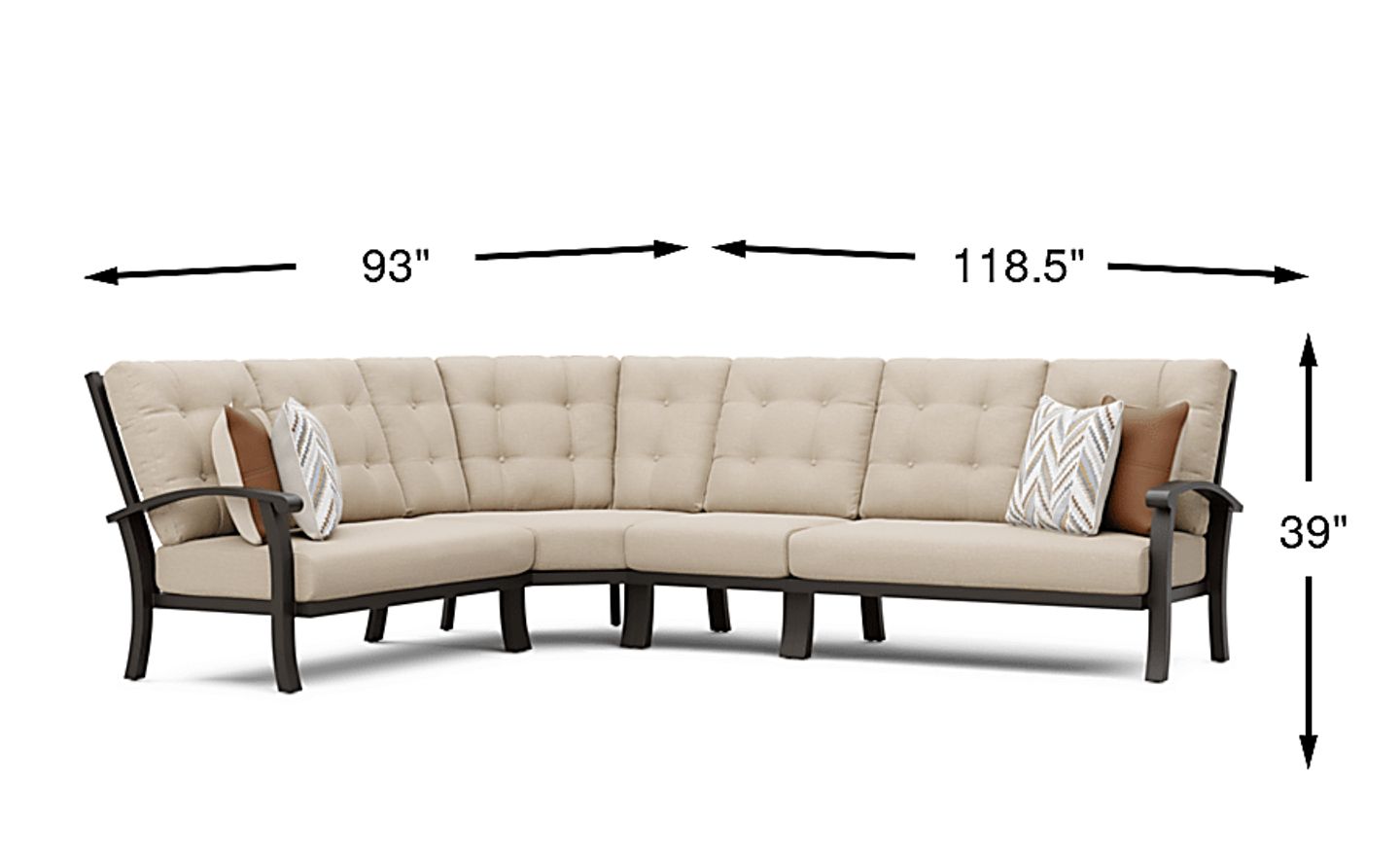 Take your style outside with the decorative and durable Lake Breeze sectional. This inviting piece features a slat back and is made with an aluminum frame in a rust resistant all-weather powder coat finish using a hand applied aged bronze finished UV protected top coat. Hemp beige Sunbrella cushions on each of the six seats resist fading and are mold and mildew resistant, creating long lasting and comfortable outdoor seating that can be enjoyed for many seasons. Decorative button tufting details on the back cushions add an appealing, tailored touch. 100% Sunbrella fabric. To clean Sunbrella fabric cushions remove dirt and spray on cleaning solution (water and mild soap), then use a soft bristle brush or sponge. Allow cleaning solution to soak into fabric and rinse thoroughly until soap residue is removed. Air dry. Do not dry clean.